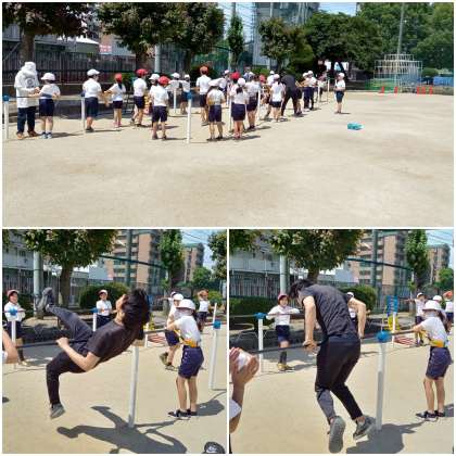 4年生が、逆上がりの練習をしています。