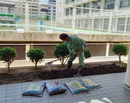 管理作業員が、花壇の整備をしています。