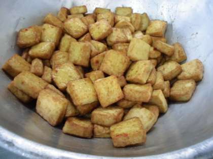 あつあげのピリ辛じょうゆかけは、焼き物機で焼いたあつあげにトウバンジャン等を使用したピリ辛のタレをかけています。