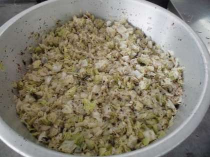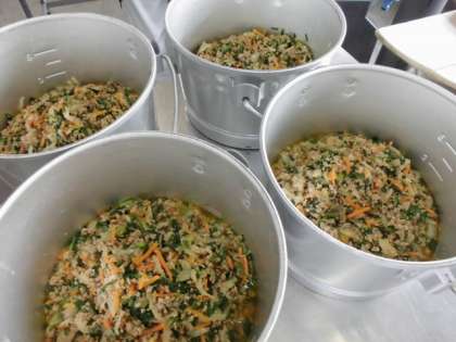 キャベツの赤じそあえは、焼き物機で蒸したキャベツに、赤じそを使用した調味液をかけ、あえています。赤じそを使用しているので、風味よくさっぱり仕上がっていました。