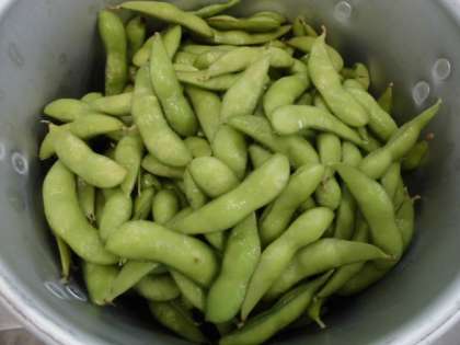 えだまめは、焼き物機で蒸したあとに塩をふってあえています。