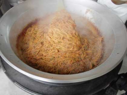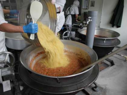 スパゲッティミートソースは、にんにく・牛ひき肉・豚ひき肉・にんじん・たまねぎ・ピーマンをいため、小麦粉と油で作ったブラウンルウ・ケチャップ・ウスターソース等で味つけしたあと、かためにゆでたスパゲッティを加えていためています。