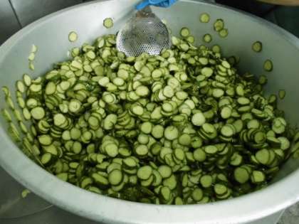 きゅうりのピクルスは、焼き物機で蒸したきゅうりをワインビネガー等で作った調味液につけ、味を含ませています。