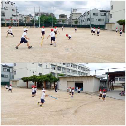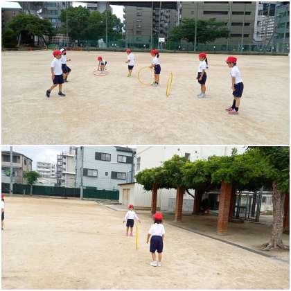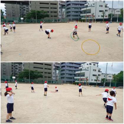 1年生が、体育科の学習で「フラフープ」を使った運動をしています。