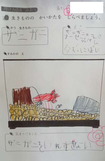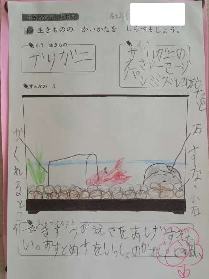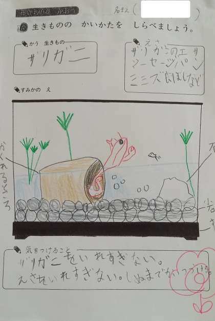 2年生が、生活科の学習で飼育している「ザリガニ」の観察を通してきづいたことを書いています。