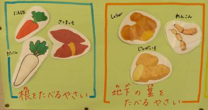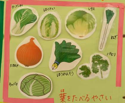給食室前には、野菜のどの部分を食べているかがわかりやすく掲示されています。