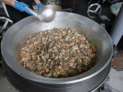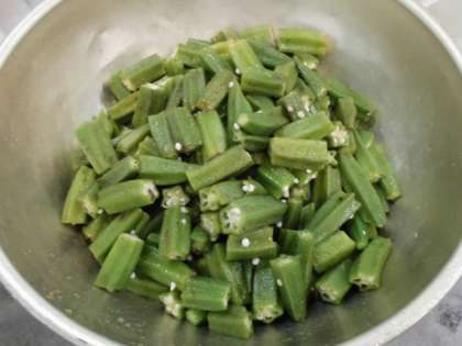 オクラのかつお梅風味は、オクラを焼き物機で蒸し、かつおぶし・梅肉等で作った調味液をかけあえています。
