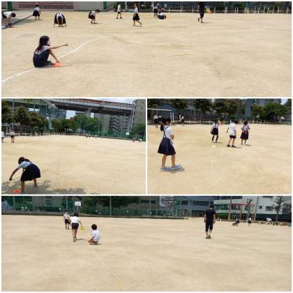 巻き尺を使って、運動場のいろいろな場所の長さを測っています。