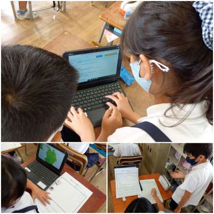 大阪府を紹介するカードを作るために、1人1台学習者用端末を使って調べ学習をしています。