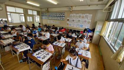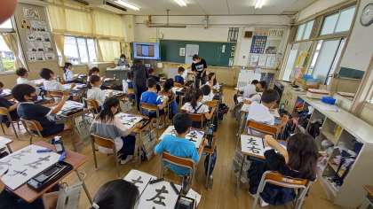 横画と左はらいに気を付けて「左右」と毛筆で書いています。