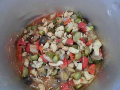 鶏肉と夏野菜のソテーは、鶏肉・夏野菜のナスときゅうり・たまねぎ・トマト缶・年に1回給食に登場する赤ピーマンを使用し、ワインビネガー等で味つけしています。