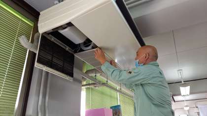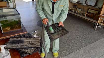 管理作業員が、各教室にあるエアコンのフィルターをきれいにしています。