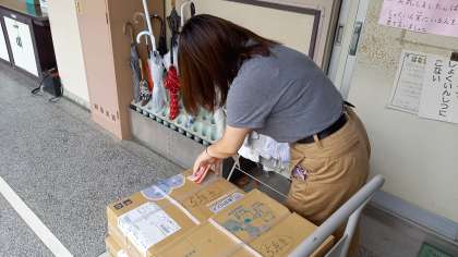 事務職員が2学期に使用する教材を受取り、使用する学年ごとに仕分けしています。
