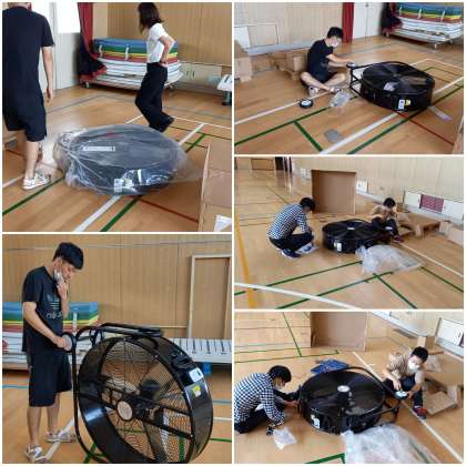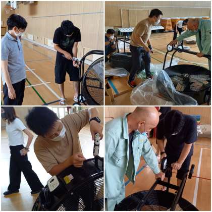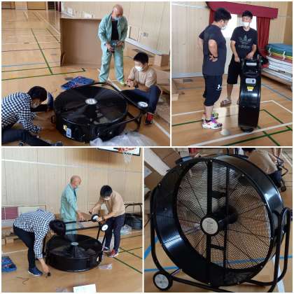 体育館の熱中症対策に大型扇風機4台を、PTAで購入していただきました。