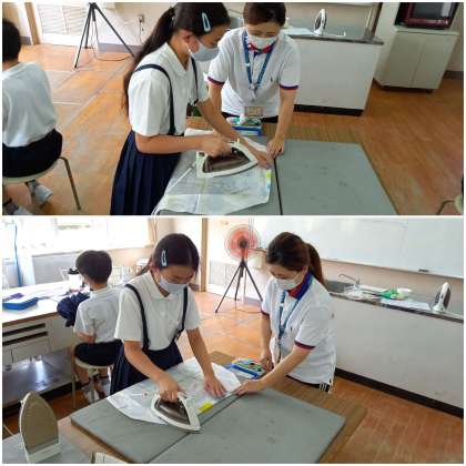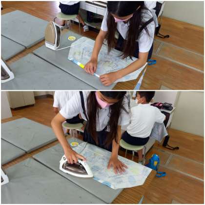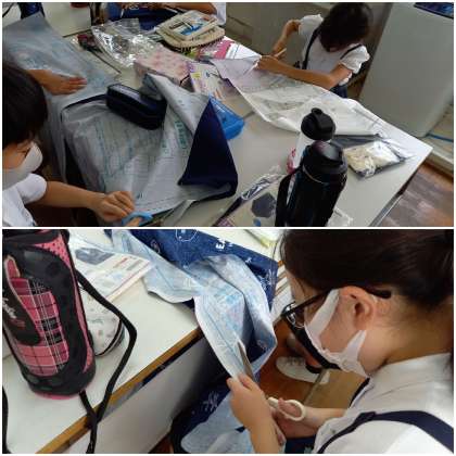 裁ちばさみを使って、布の余分な部分を切ったり、アイロンで折り目を付けたりと作業を進めています。