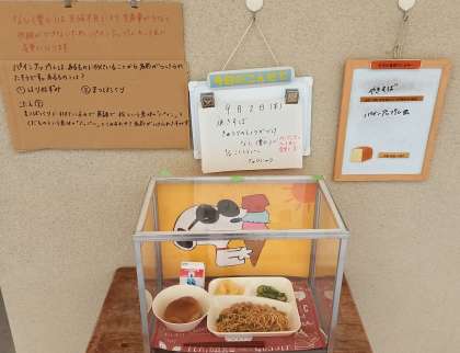 今日の献立は、「焼きそば、きゅうりのしょうがづけ、パインアップルカット缶」でした。