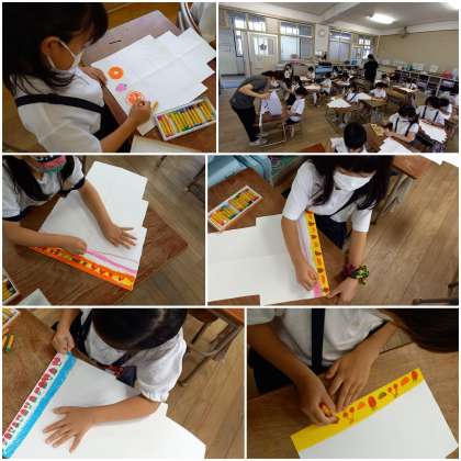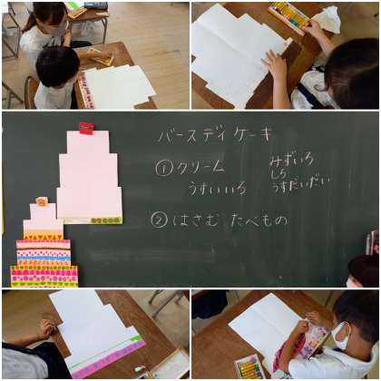パスをしっかり握りしめ、子ども達は大好きなフルーツたっぷりのケーキを描いています。