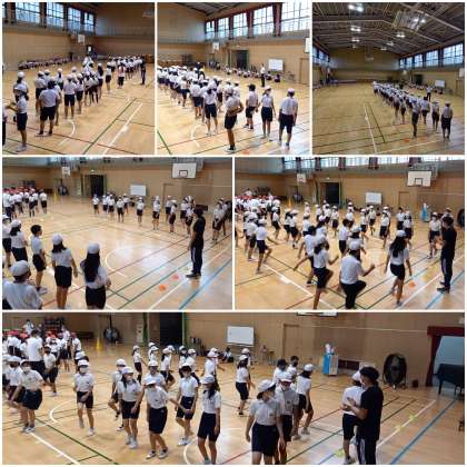 体育館では、6年生が団体行動に取り組んでいます。