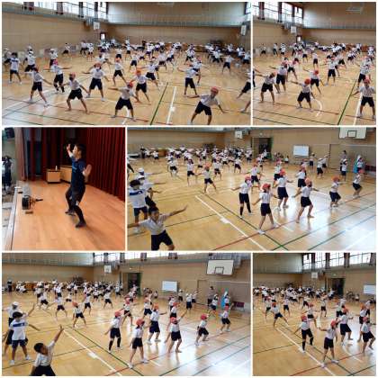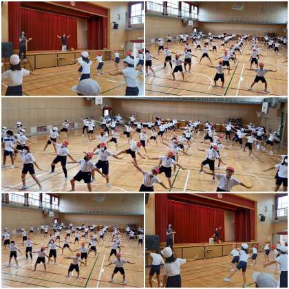 踊りながら移動すると、縦と横の列が崩れがちになるので、子ども達は繰り返し練習しています。