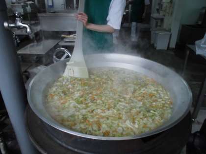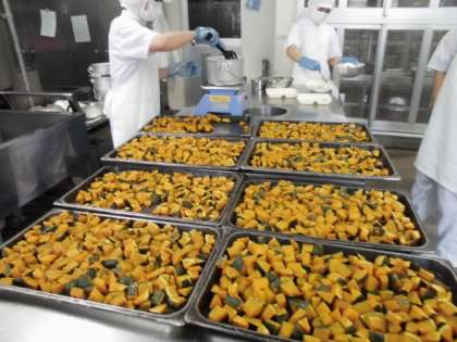 今日の献立は、フランクフルトのケチャップソース・スープ・焼きかぼちゃ・黒糖パン・牛乳でした。