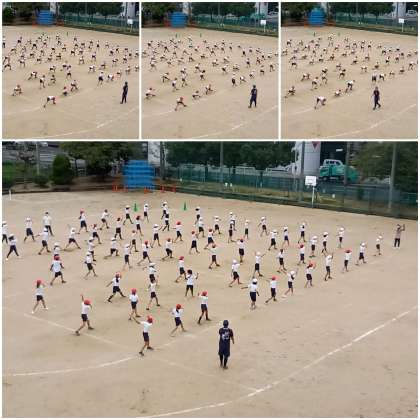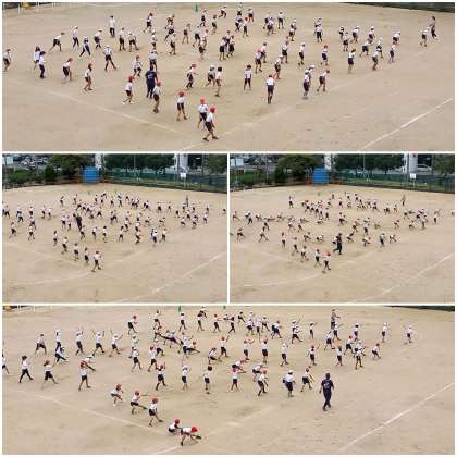 運動場で、入退場の方法や隊形移動を確認しながら「ソーラン節」を踊っています。