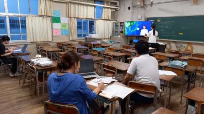 教育実習生が、指導教官からの指導を受けながら授業準備に取り組んでいます。