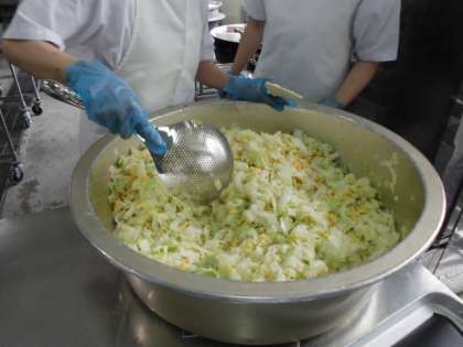 キャベツとコーンのサラダは、焼き物機で蒸したキャベツとコーンに、ノンエッグドレッシングをかけて食べます。