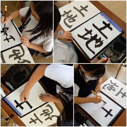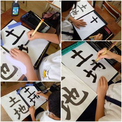 穂先を整え、手本をよく見て一画ずつ、ゆっくりていねいに書いています。