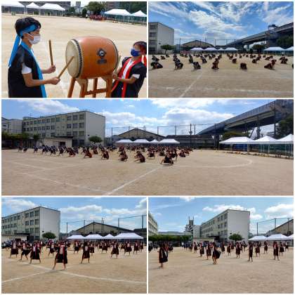 自分で選んだ一文字を背中に、力強く演技する5年生。