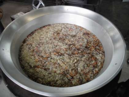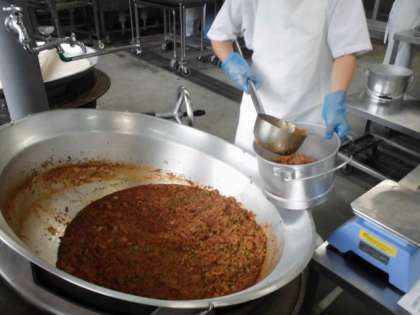にんにくを香り良くいため、ひき肉・たまねぎをいため、カレー粉・ケチャップ・ウスターソース等で味つけし、青みにグリンピースを使用しています。