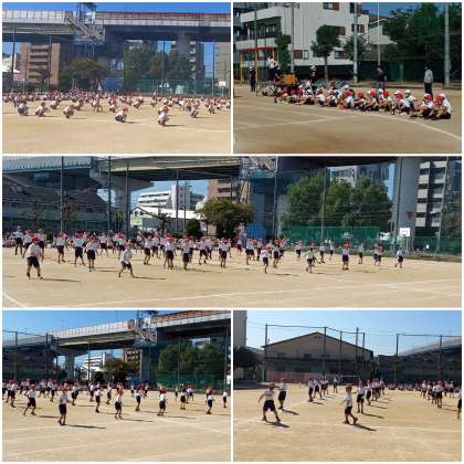 晴天の中、2時限目・3時限目に、運動会で披露した団体演技を見合う「異学年交流」を行いました。