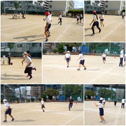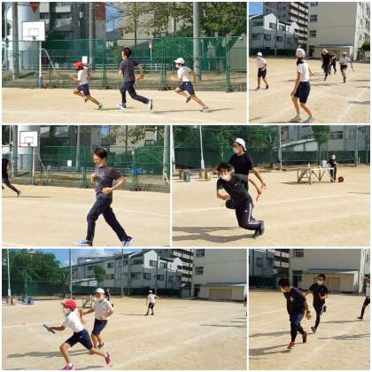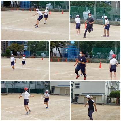 1時限目の運動場で、6年生が全員リレーに取り組んでいます。