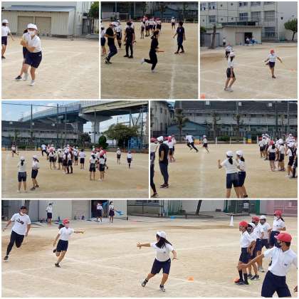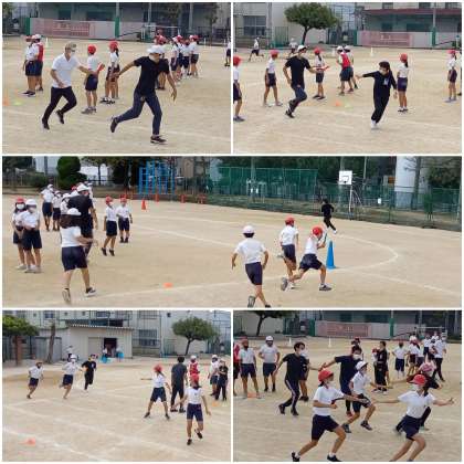 それに対抗する教員は、参加者6名はそれぞれ運動場1周を走りバトンを繋ぎます。