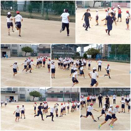 各学級、児童38名+担任の計39名が、それぞれ運動場半周を走りバトンを繋ぎます。