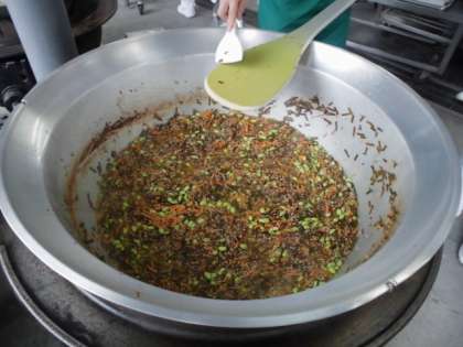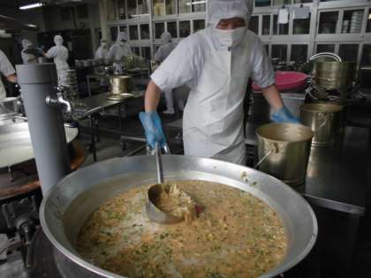 さつまいものみそ汁は、にぼしでだしを取り、鶏肉・さつまいも・うすあげ・はくさい・たまねぎ・青ねぎを使用しています。さつまいもの甘みが出ていました〜。