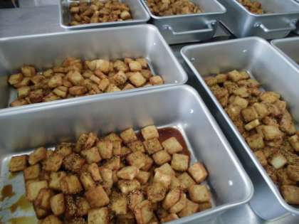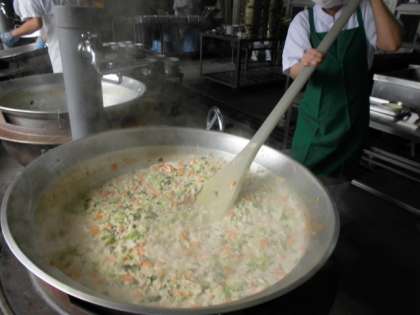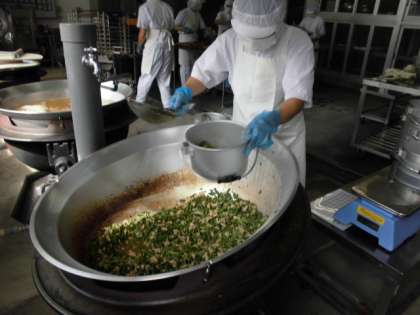 はくさいのクリーム煮は、鶏肉・はくさい・たまねぎ・にんじん・チンゲンサイ・しいたけを使用し、牛乳・クリームを加えてでんぷんでとろみをつけた中華風のクリーム煮です。彩りのよいクリーム煮は、今日の気候にピッタリで「ごちそうさまでした〜」とからっぽになった食缶を返却してくれました。