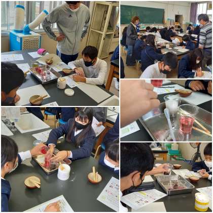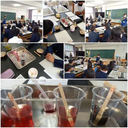 今日は、特定非営利活動法人 コアネット関西本部インキュベーターの皆さんに講師になっていただき、水溶液の性質の学習を通して、発砲入浴剤作りに取り組んでいます。
