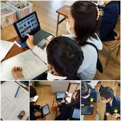 平野図書館から借りている図書や1人1台端末を使って、自分の興味のあるものについて調べています。
