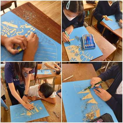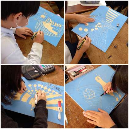 彫刻刀を使用するので、安全に気を付けていつも以上に集中しています。