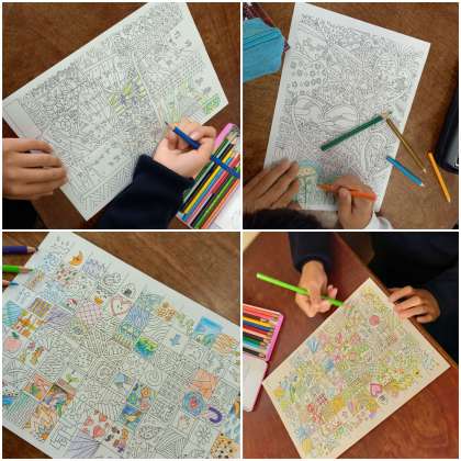 細かい線に気を付けて、隣り合う色のバランスを考えて色鉛筆で描いています。