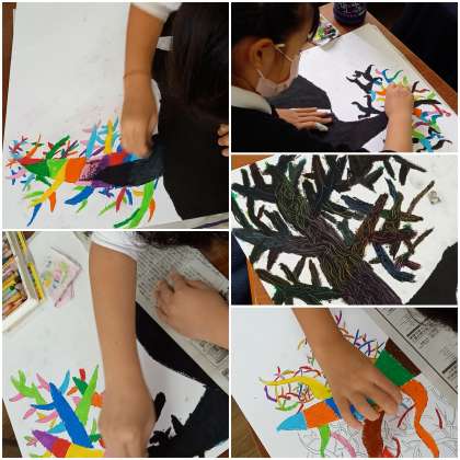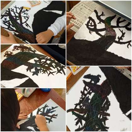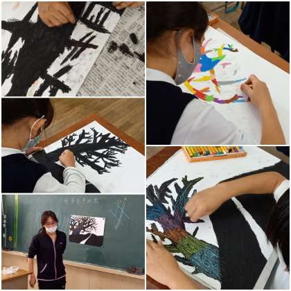 子ども達は、モチモチの木が枝を広げた幻想的な風景を描いています。