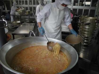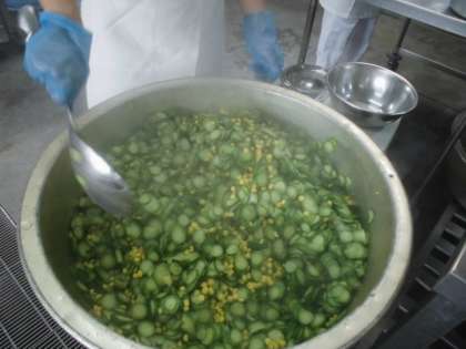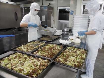 牛肉のカレー風味焼きは、牛肉にカレー粉や粗挽きこしょう等で下味をつけ、キャベツ・ピーマンを混ぜ合わせ焼き物機で焼いています。