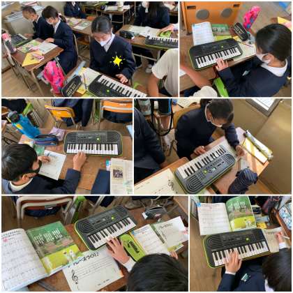 ミニキーボードを使いながら、3拍子のフレーズを作っています。