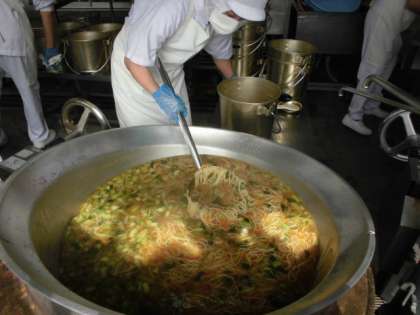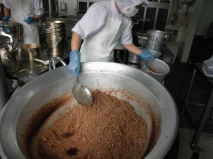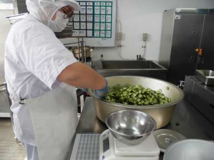 きゅうりの甘酢づけは、焼き物機で蒸したきゅうりを砂糖・米酢等で作った調味液につけ、味を含ませます。