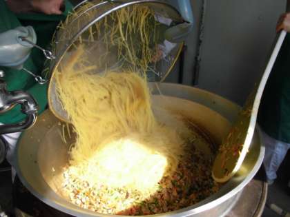 ウインナーときのこの和風スパゲッティは、オリーブ油でにんにくを香りよくいため、ウインナー・ベーコン・季節の食材のしめじ、しいたけ・たまねぎ・にんじん・ピーマンを使用し、しょうゆベースの和風の味つけです。食べるときにきざみのりをかけて食べるので風味が増します。