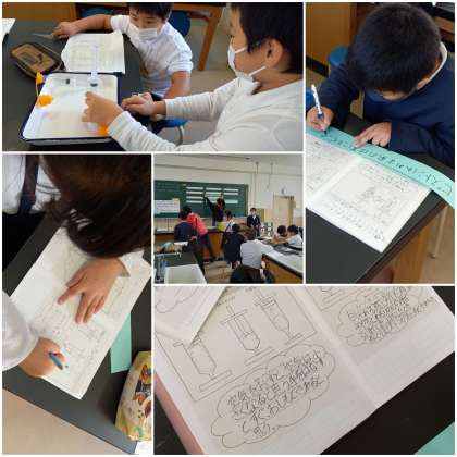 注射器を使った実験で、わかったこと・気づいたことを班ごとにまとめています。
