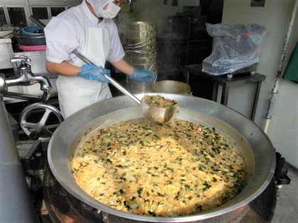 みそ汁は、だしこんぶ・けずりぶしで出汁を取り、うすあげ・はくさい・にんじん・わかめを使用しています。