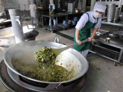 こまつなのいためものは、豚肉と福岡県産のこまつなをいため、砂糖としょうゆで味つけしています。