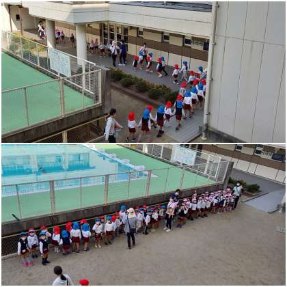 園外保育に向けて、今日も瓜破北幼稚園のお友達が「歩行練習」にやってきました。