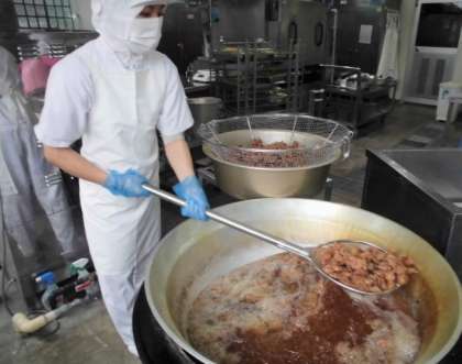 くじらのたつたあげは、しょうが汁・料理酒・こいくちしょうゆでしっかり下味をつけ、でんぷんをまぶして揚げています。